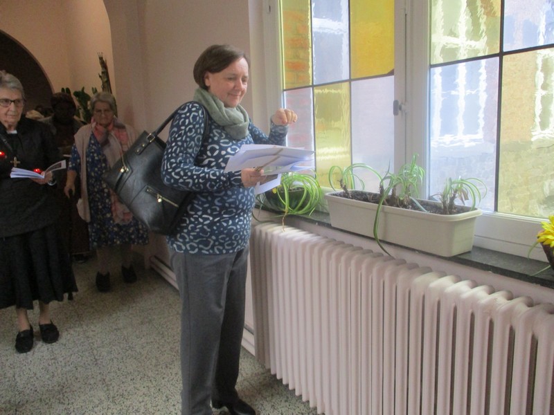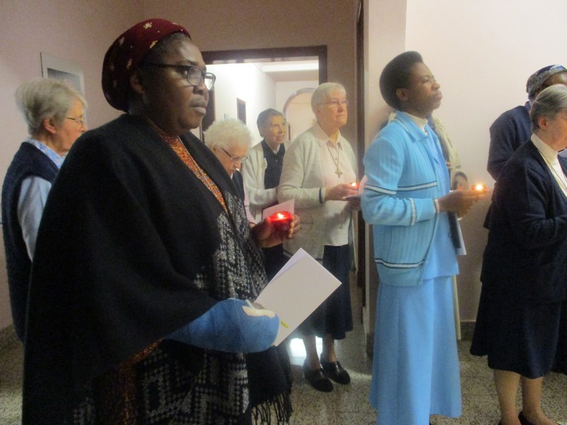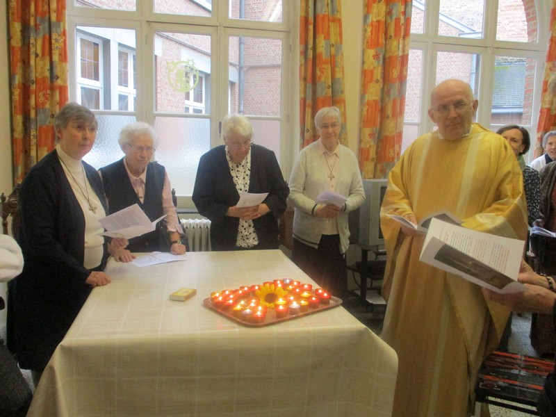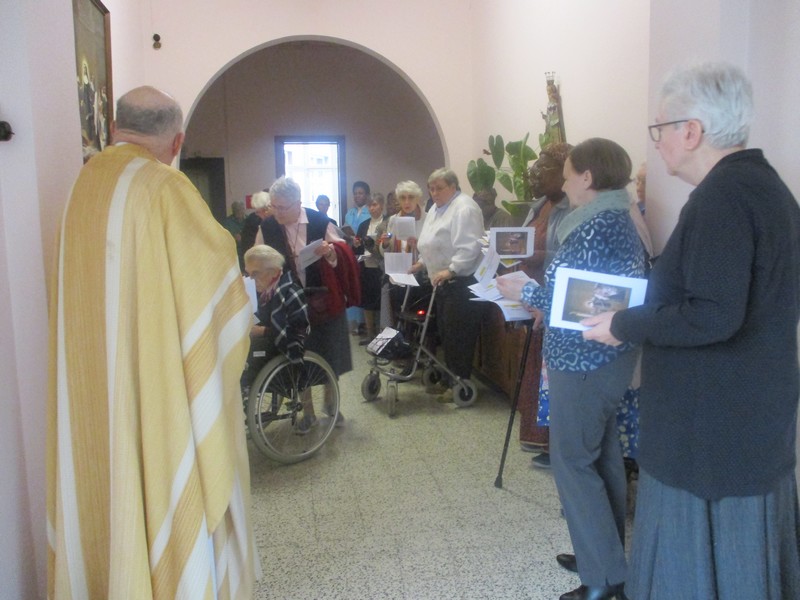 Lors de la traditionnelle procession des lumières, nous avons fait une première halte face à la peinture nous rappelant la vision du 2 février 1806. Puis nous avons repris notre marche à travers les 12 mois auxquels les thèmes nous associaient à toute la Congrégation à travers le monde (https://snddensjb50.org/ ).
