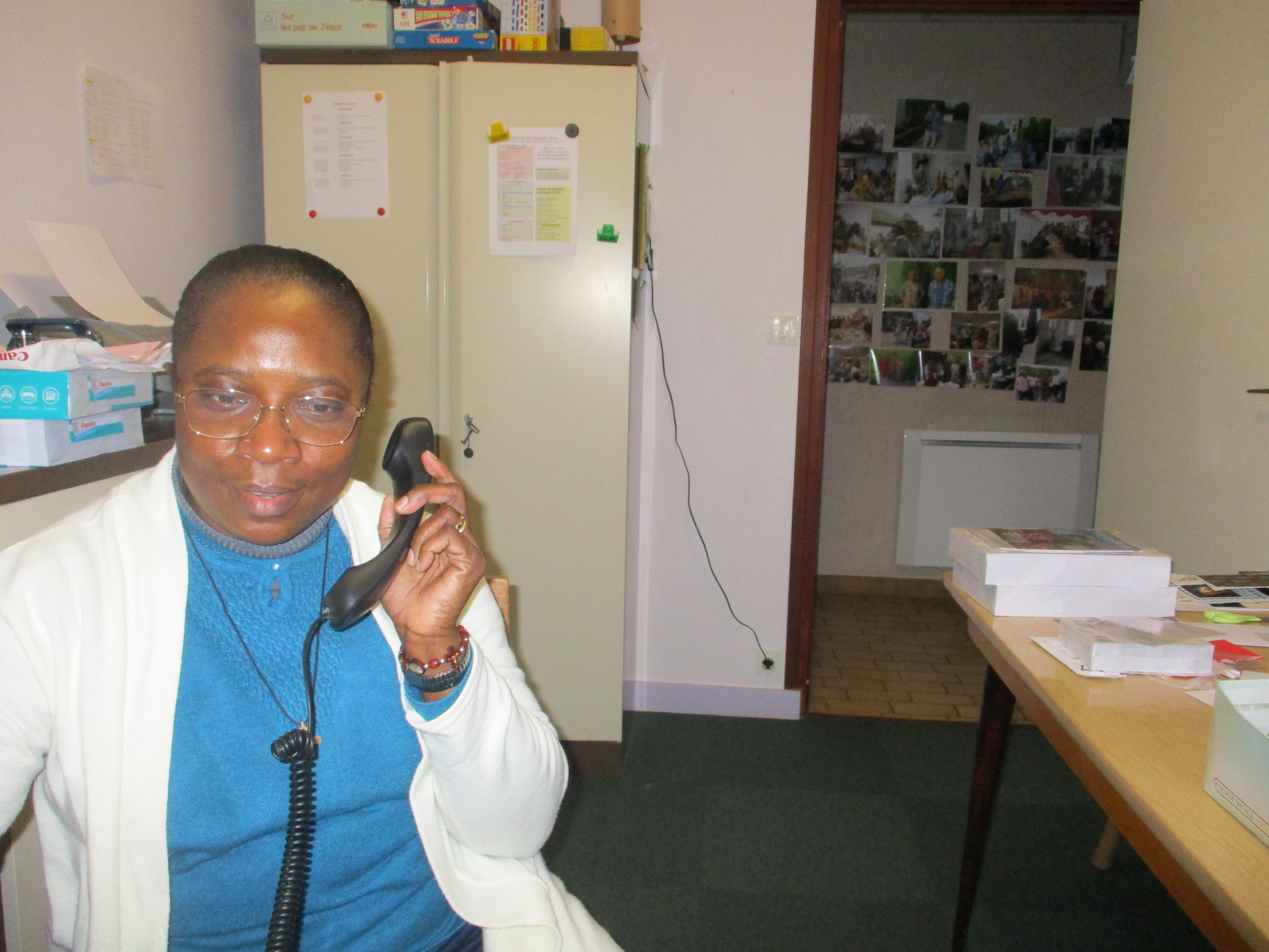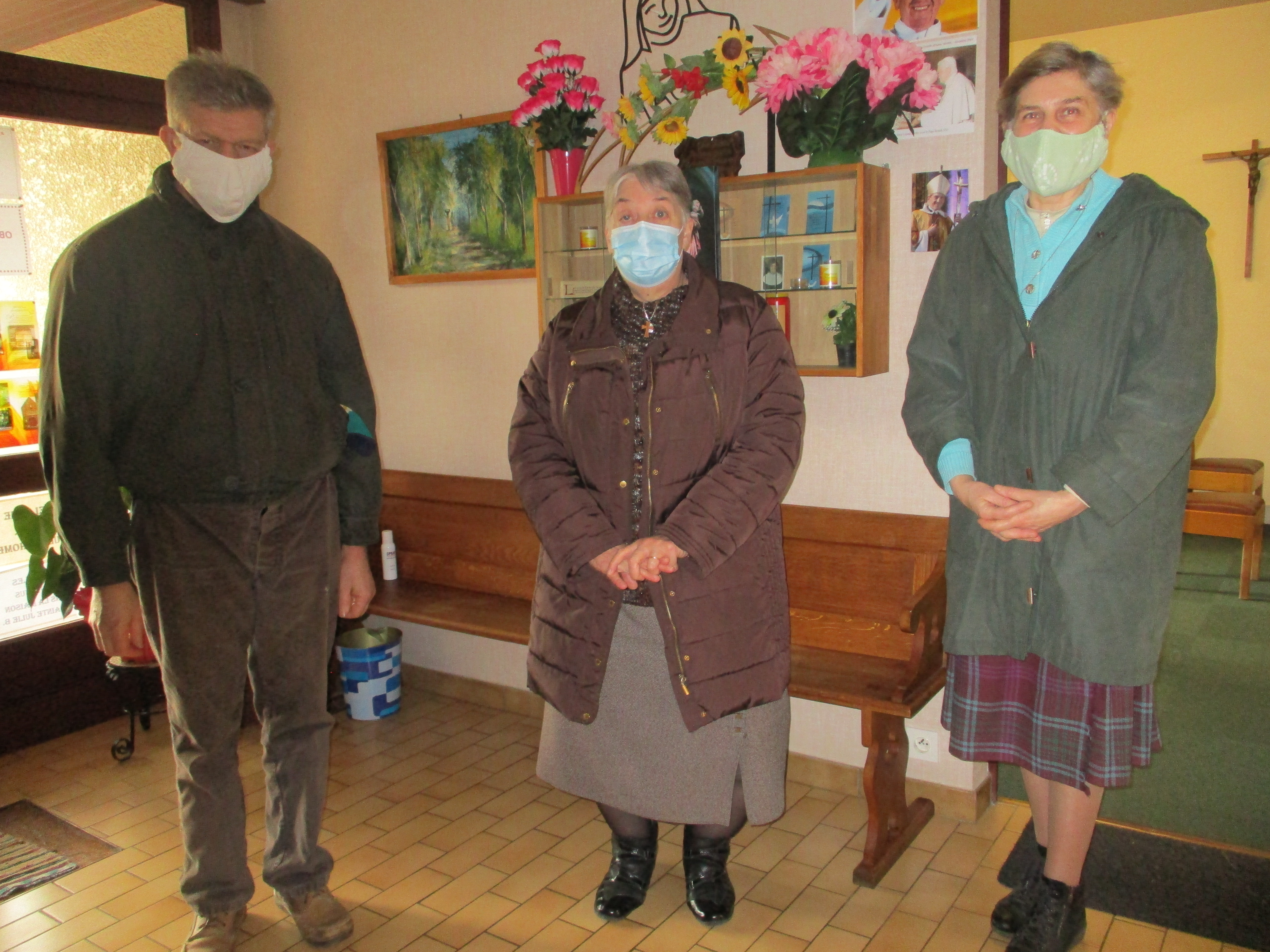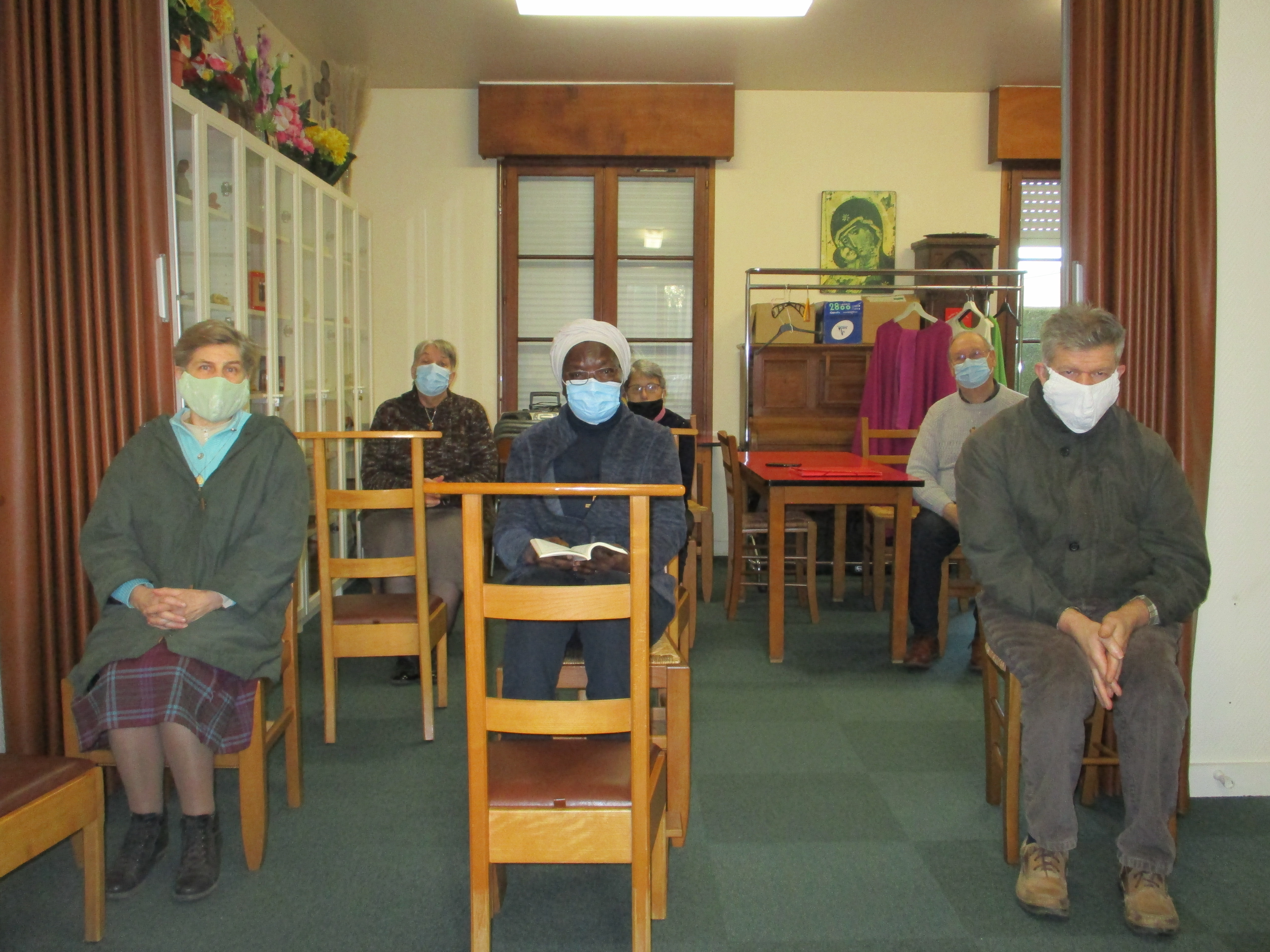 Pour la maison de camps « Les Pins Verts », nous recevons beaucoup de coups de téléphone pour annuler des séjours, pour les reporter à une autre période ou pour des remboursements qui se font tous les mois jusqu’à aujourd’hui. En juillet et août 2020, nous avons quand même pu recevoir les enfants. Malgré la peur, cela s’est bien passé. Il y a de nouvelles inscriptions pour plus tard, nous vivons au jour le jour, nous restons patientes et à l’écoute. Pour notre vie spirituelle: la matinée est libre pour chacune. A partir de 17 heures, nous suivons la messe sur internet, puis le chapelet de miséricorde et la prière à Saint Roch pour le monde, notre congrégation, nos familles et amis. Viennent ensuite les vêpres et l’adoration jusqu’à 20 heures. En ce qui concerne notre apostolat en dehors: nos visites et communions continuent à distance. La responsable nous met au courant de la situation des personnes que nous suivons. Pour rester en communion avec elles à Noël, à Pâques et lors de la journée des malades, nous avons fait des cartes de vœux. Les visites de la Croix Rouge se font par vidéo sur WhatsApp pour continuer la vie et de se voir. Maintenant que nous pouvons célébrer la messe en paroisse avec un nombre limité de 15 personnes, nous essayons de nous inscrire de temps en temps quand la messe est à la ville basse où nous pouvons nous rendre à pieds. Malgré tout cela, les rencontres sont très importantes, il y a le téléphone mais la présence est essentielle. Les paroissiens nous cherchent mais il faut se protéger et protéger les autres; le temps viendra où la vie reprendra.