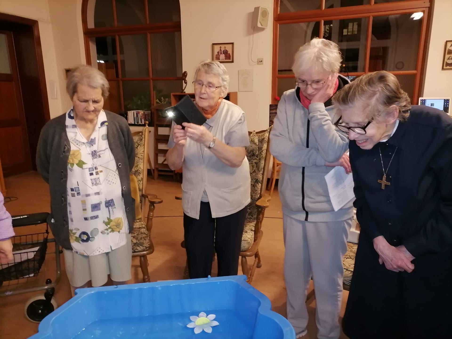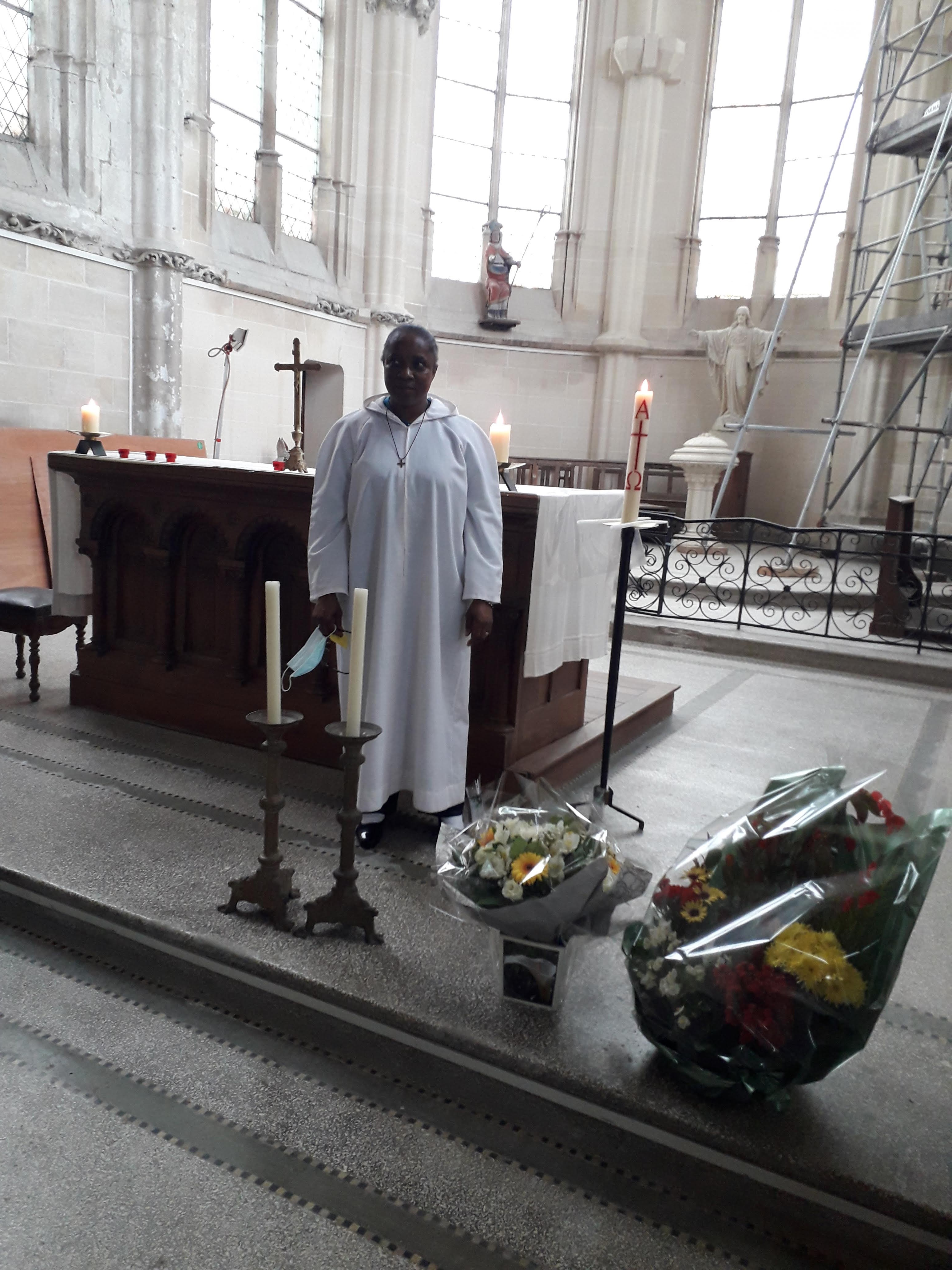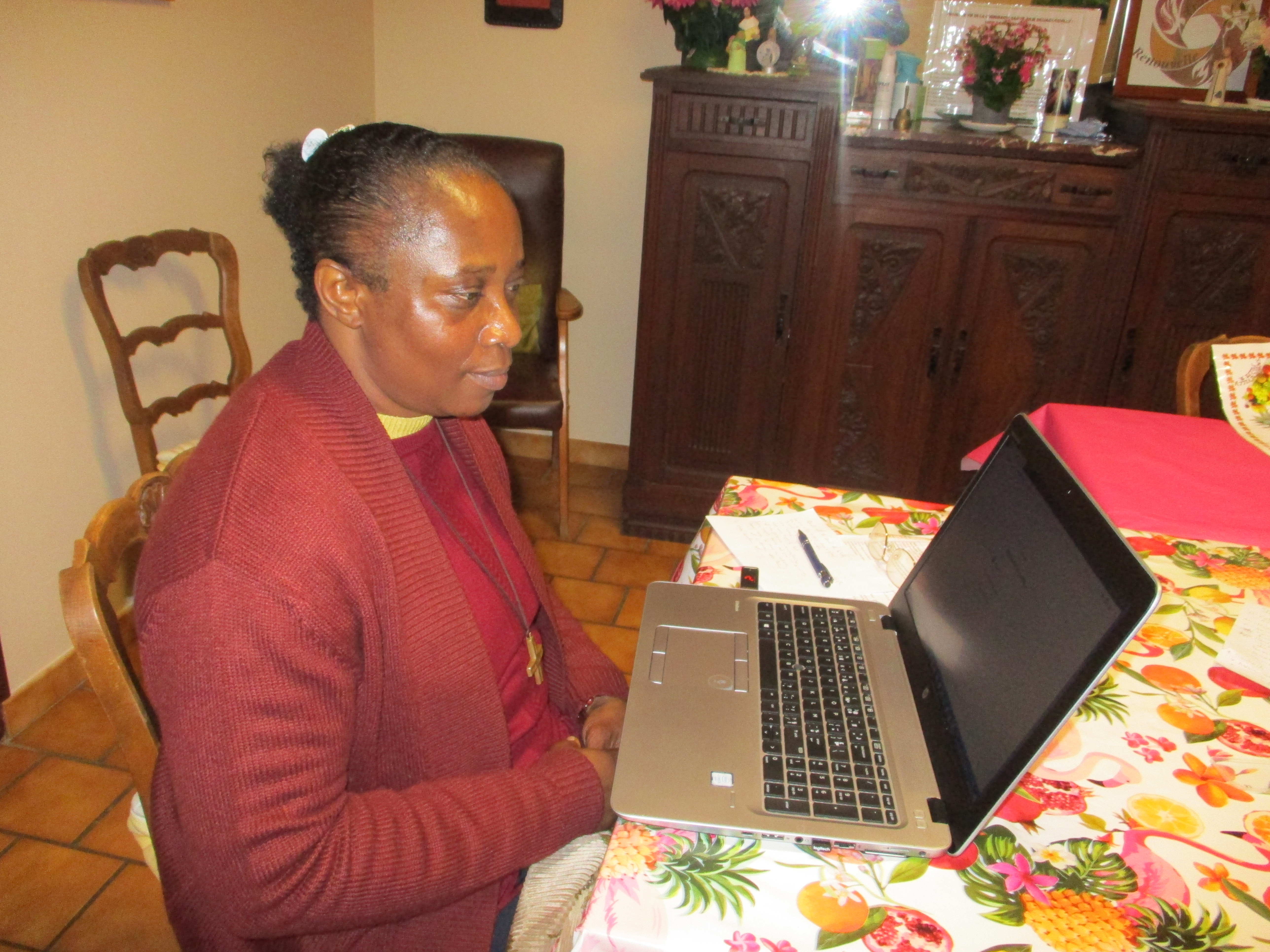 Pour la maison de camps « Les Pins Verts », nous recevons beaucoup de coups de téléphone pour annuler des séjours, pour les reporter à une autre période ou pour des remboursements qui se font tous les mois jusqu’à aujourd’hui. En juillet et août 2020, nous avons quand même pu recevoir les enfants. Malgré la peur, cela s’est bien passé. Il y a de nouvelles inscriptions pour plus tard, nous vivons au jour le jour, nous restons patientes et à l’écoute. Pour notre vie spirituelle: la matinée est libre pour chacune. A partir de 17 heures, nous suivons la messe sur internet, puis le chapelet de miséricorde et la prière à Saint Roch pour le monde, notre congrégation, nos familles et amis. Viennent ensuite les vêpres et l’adoration jusqu’à 20 heures. En ce qui concerne notre apostolat en dehors: nos visites et communions continuent à distance. La responsable nous met au courant de la situation des personnes que nous suivons. Pour rester en communion avec elles à Noël, à Pâques et lors de la journée des malades, nous avons fait des cartes de vœux. Les visites de la Croix Rouge se font par vidéo sur WhatsApp pour continuer la vie et de se voir. Maintenant que nous pouvons célébrer la messe en paroisse avec un nombre limité de 15 personnes, nous essayons de nous inscrire de temps en temps quand la messe est à la ville basse où nous pouvons nous rendre à pieds. Malgré tout cela, les rencontres sont très importantes, il y a le téléphone mais la présence est essentielle. Les paroissiens nous cherchent mais il faut se protéger et protéger les autres; le temps viendra où la vie reprendra.