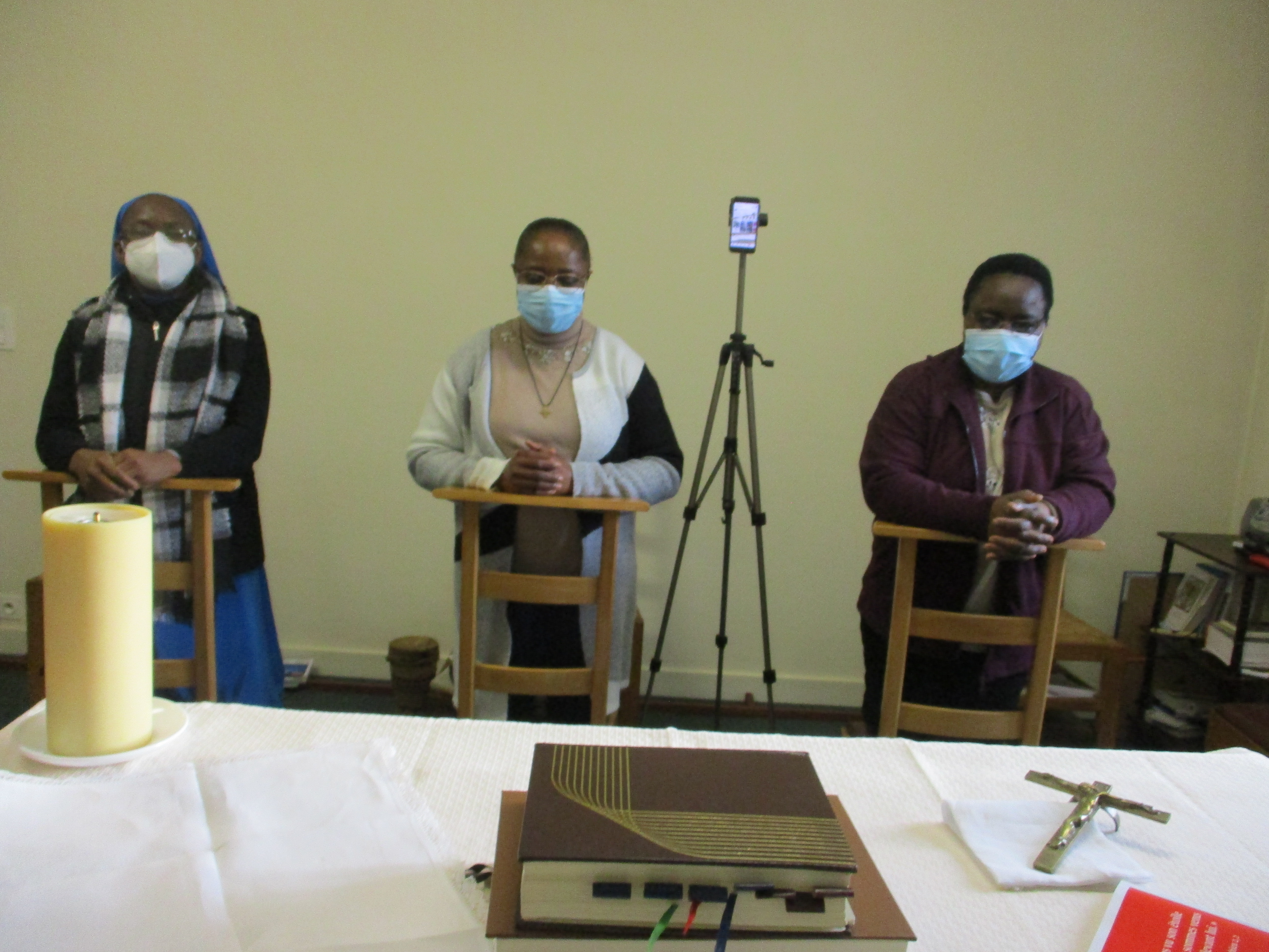 Ce virus nous a apporté un grand changement sur toute notre vie, spirituelle, morale, physique et apostolique. Nous avons adapté notre horaire selon ce temps de pandémie. Au début nous avons paniqué en écoutant les médias à cause des nombreux décès, surtout dans les maisons des repos, et la fermeture de beaucoup d’activités comme notre maison de camps. Il a fallu trouver une autre façon de travailler. Nous devons rester confinées chez nous, la grille fermée, sans messe à la maison ni à la paroisse. Nous suivons la messe à la télévision ou sur internet pour celle du matin. Nous faisons des cours sur commande avec les personnes de bonne volonté.