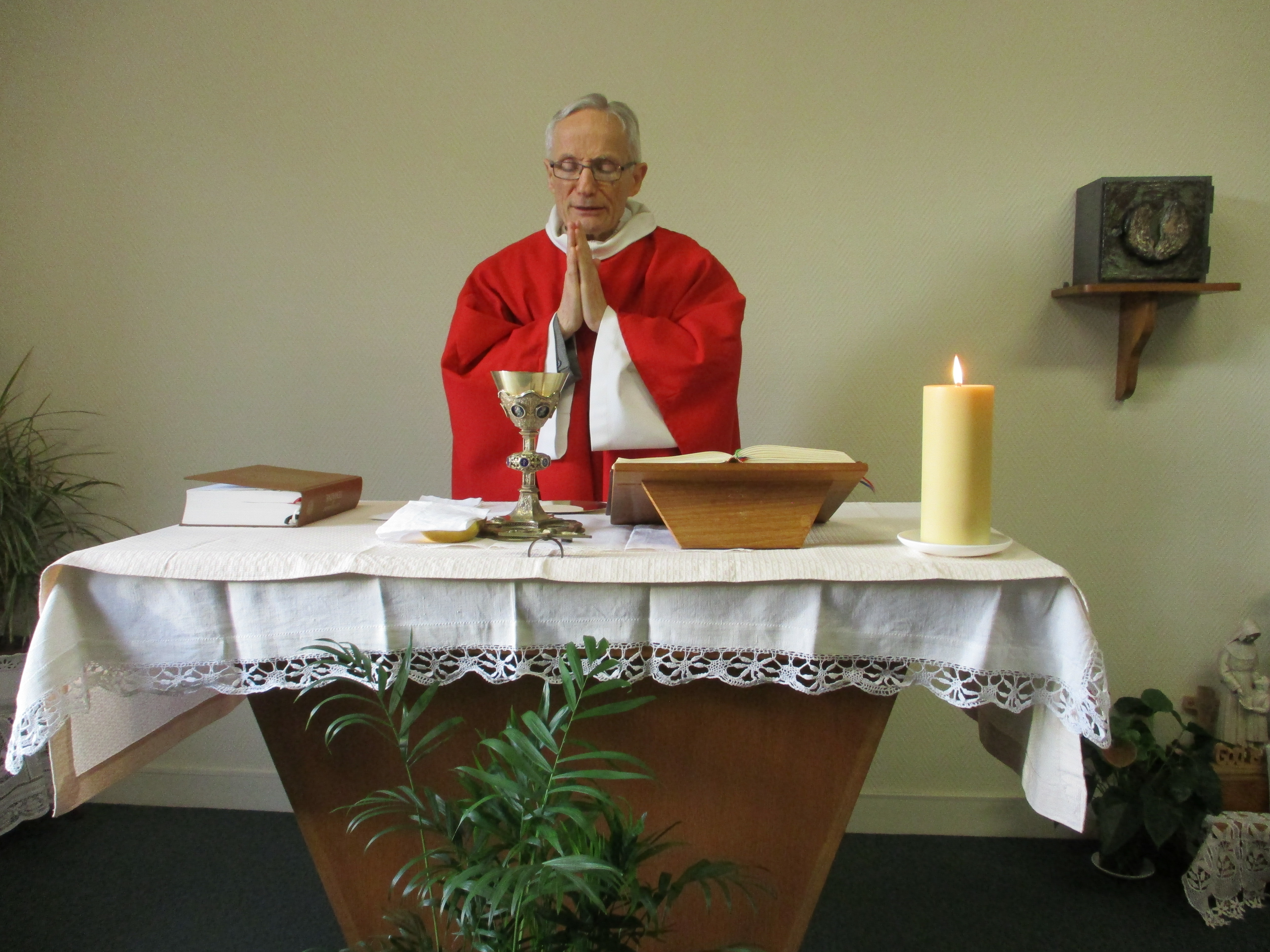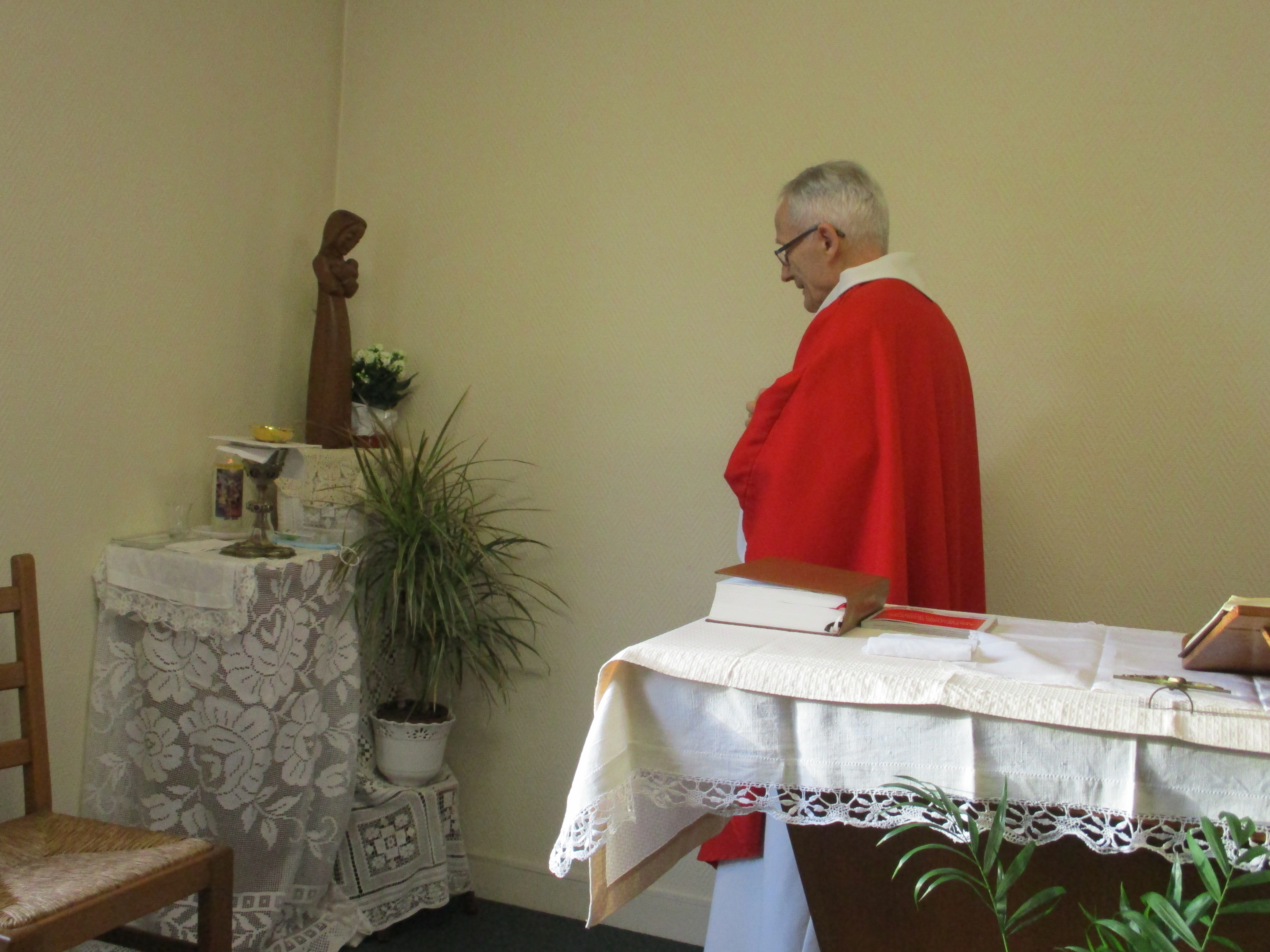 La chapelle est toujours ouverte. Malgré le confinement, des chrétiens continuent à y venir. Nous transmettons en direct nos messes quotidiennes. Après la messe, nous nous tournons toujours vers Marie, notre Mère. Puis, les chrétiens partagent avec le père curé.